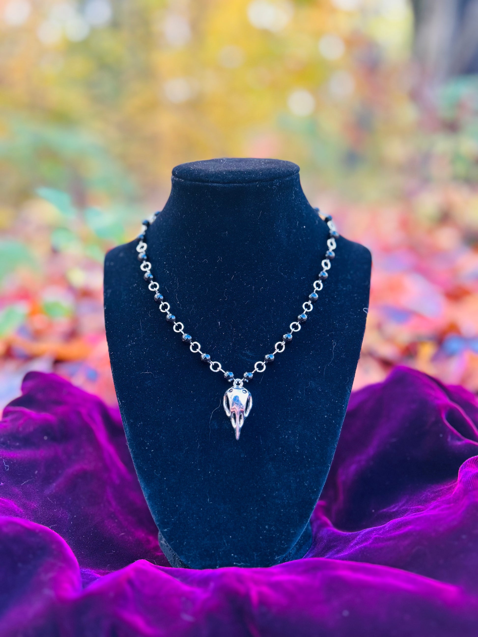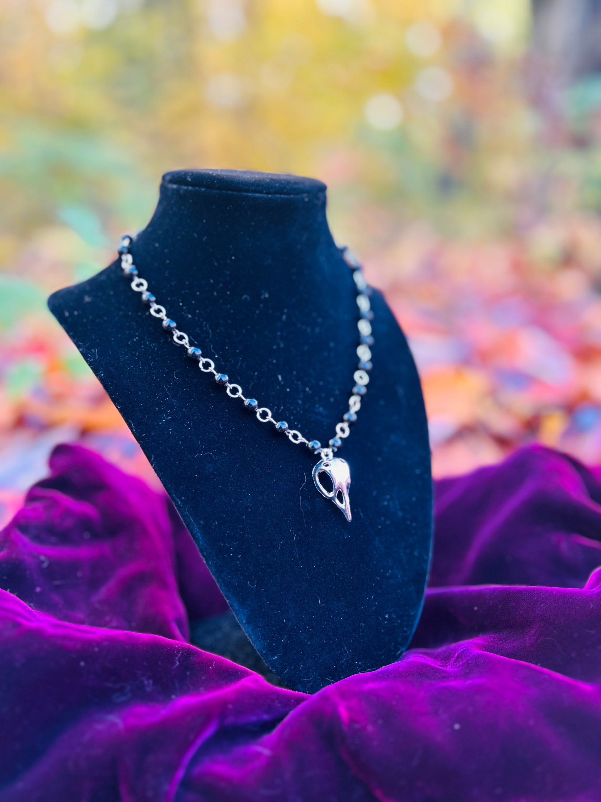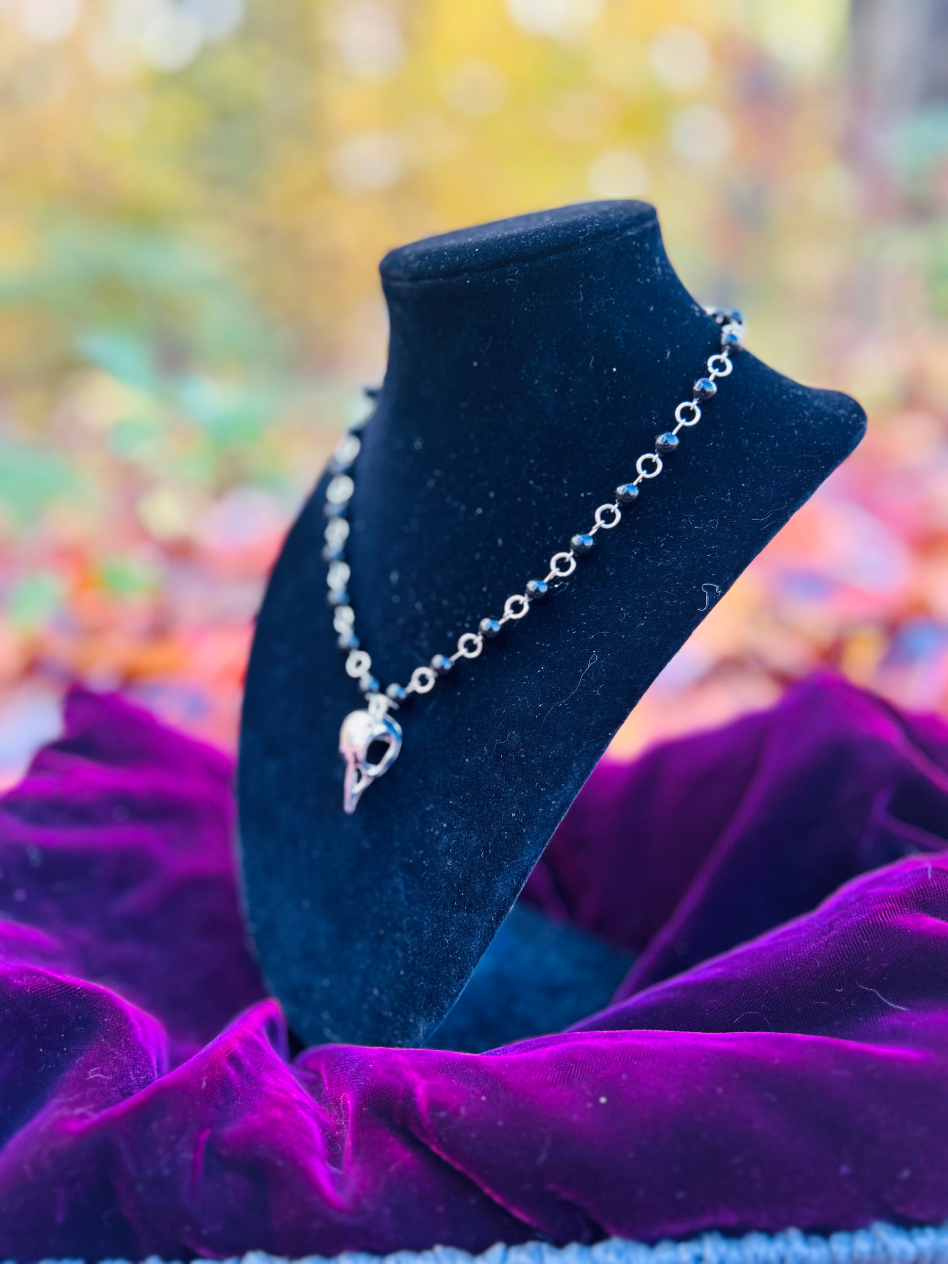 Handmade Silver Black Obsidian Bird Skull Necklace!